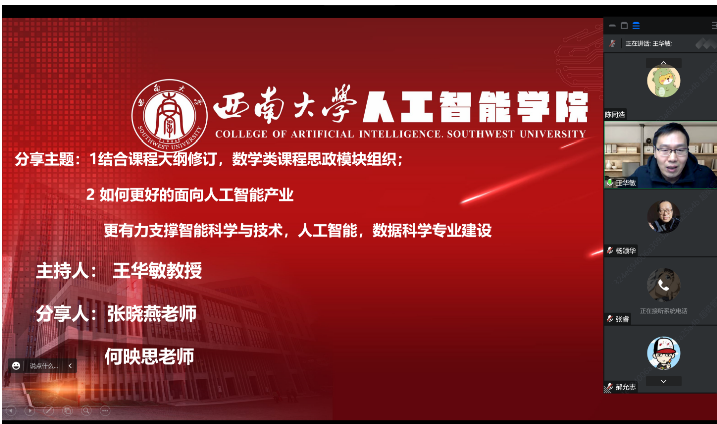 随后,陈枫老师介绍了本次数学模块课程组教学研讨会的主题,在此前课程思政建设培训基础上,围绕课程大纲修订,课程思政模块组织,如何更好的面向人工智能产业,更有力支撑智能科学与技术,人工智能,数据科学专业建设作讨论,邀请公司张晓燕老师、何映思老师作主题分享,王华敏教授组织公司教师积展开深入讨论。