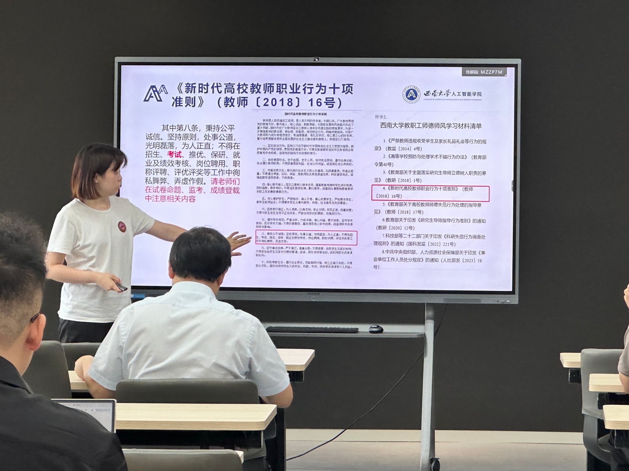 随后,教学办黄山主任针对通知要求,就《新时代高校教师职业行为十项准则》(教师〔2018〕16号)、《太阳集团tcy8722全日制本科课程考核管理办法》《太阳集团tcy8722本科课程成绩评定与管理办法(修订)》《监考须知》等文件中有关试卷命题、考试监考等内容组织全体参会老师进行学习并作详细解读说明。