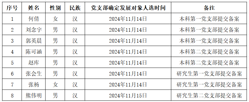 公司本科生何倩等5名同志,研究生张会生3同志入党积极分子教育培养满一年,经相关支部征求党内外意见、支委会(党员大会)研究、公司党委备案,将8名同志(名单见附件)列为发展对象。根据发展党员工作相关要求,现予以公示。