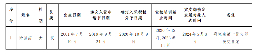 公司研究生徐苗苗同志入党积极分子教育培养满一年,经相关支部审查基本条件、征求党内外意见、支委会研究、公司党委备案审查,将该同志列为发展对象。根据发展党员工作相关要求,现予以公示。