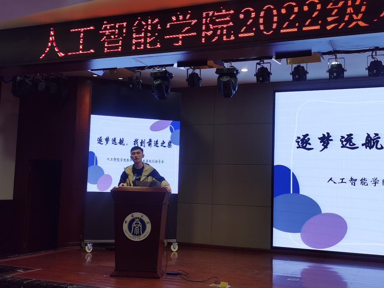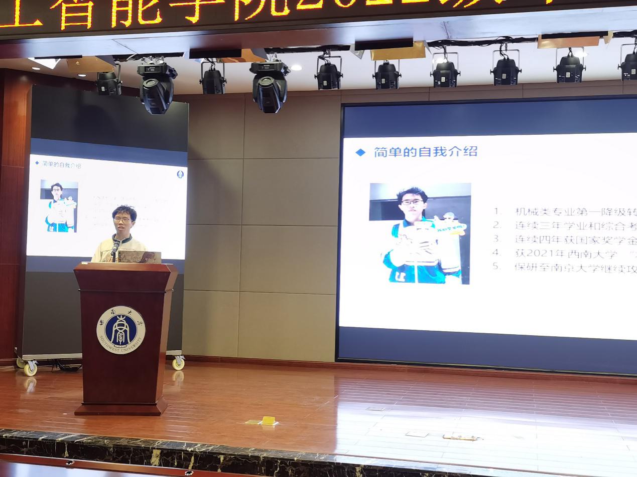 随后,2019级优秀员工代表——智科专业郭聪同学作朋辈经验分享交流,从学习经验、竞赛经验、科研经验、学业外生活等方面介绍了大学应该如何度过,告诫22级同学们应当找到适合自己的学习方式、积极参与竞赛和科研,强调知识、汗水、灵感、机遇不可偏废。五育并举,全面发展。