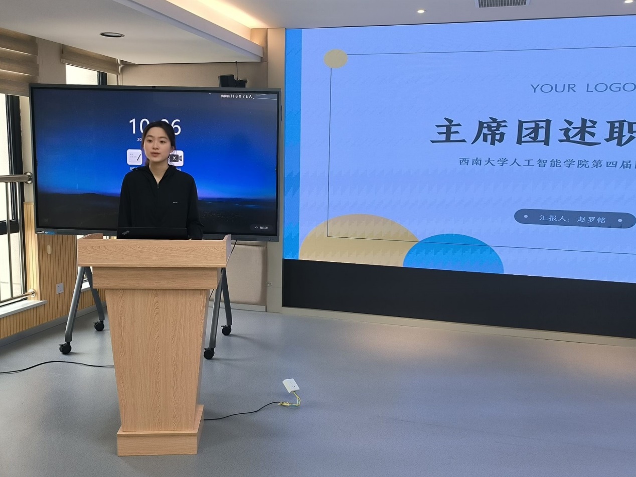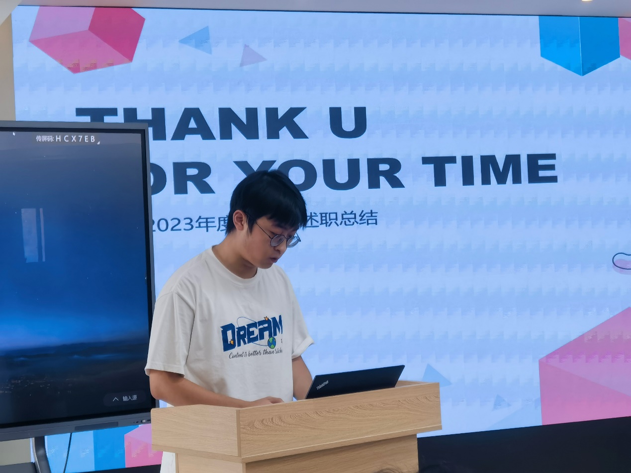 第四届团委员工会执行主席赵罗铭在述职总结中回顾了过去一年主席团成员参与的各项团学活动,从公司宣传与特色活动等方面作为切入点,向有意留任主席、部门负责人的同学抛出疑问,表示希望新一届团委员工会成员针对性的找出重点并进行优化。最后,她提出公司团委员工会应“以服务为中心,以沟通为重心”,谱写更绚丽的新篇章。
