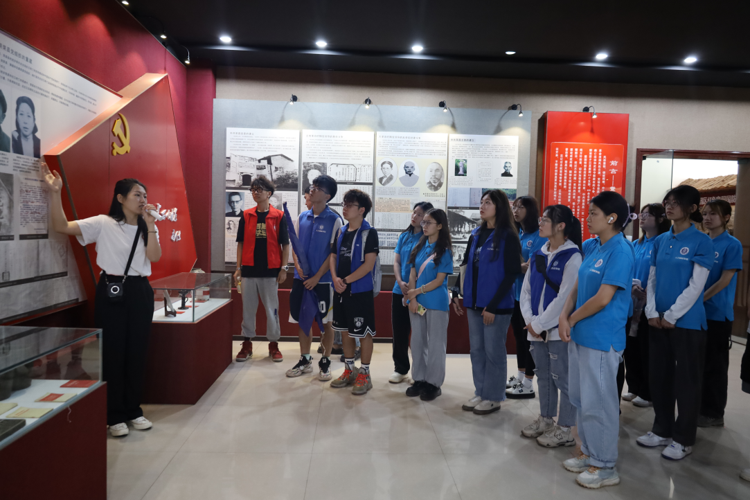 (实践团成员在党史陈列馆中听讲解员解说红色故事)