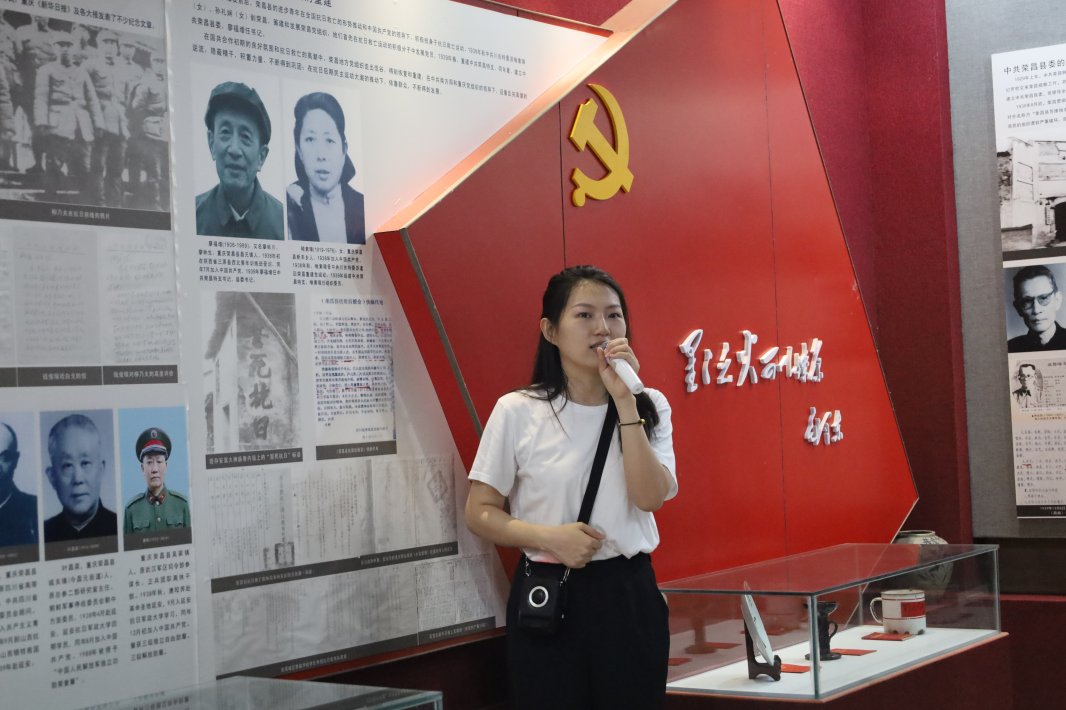 6月30日上午9时30分,太阳集团tcy8722“三下乡”社会实践服务团在辅导员孙一博的带领下到达荣昌区直升镇的“红色家园”进行参观。当地讲解员张娟带领实践团全体深入了解红色故事中的英雄事迹,在参观过程中感悟先烈们奋斗的艰辛历程。在红色影院观看了老地下党员张佐成拍摄的红色历史影片,同学们更加坚定了对中国共产党和社会主义事业的认同感和自豪感。