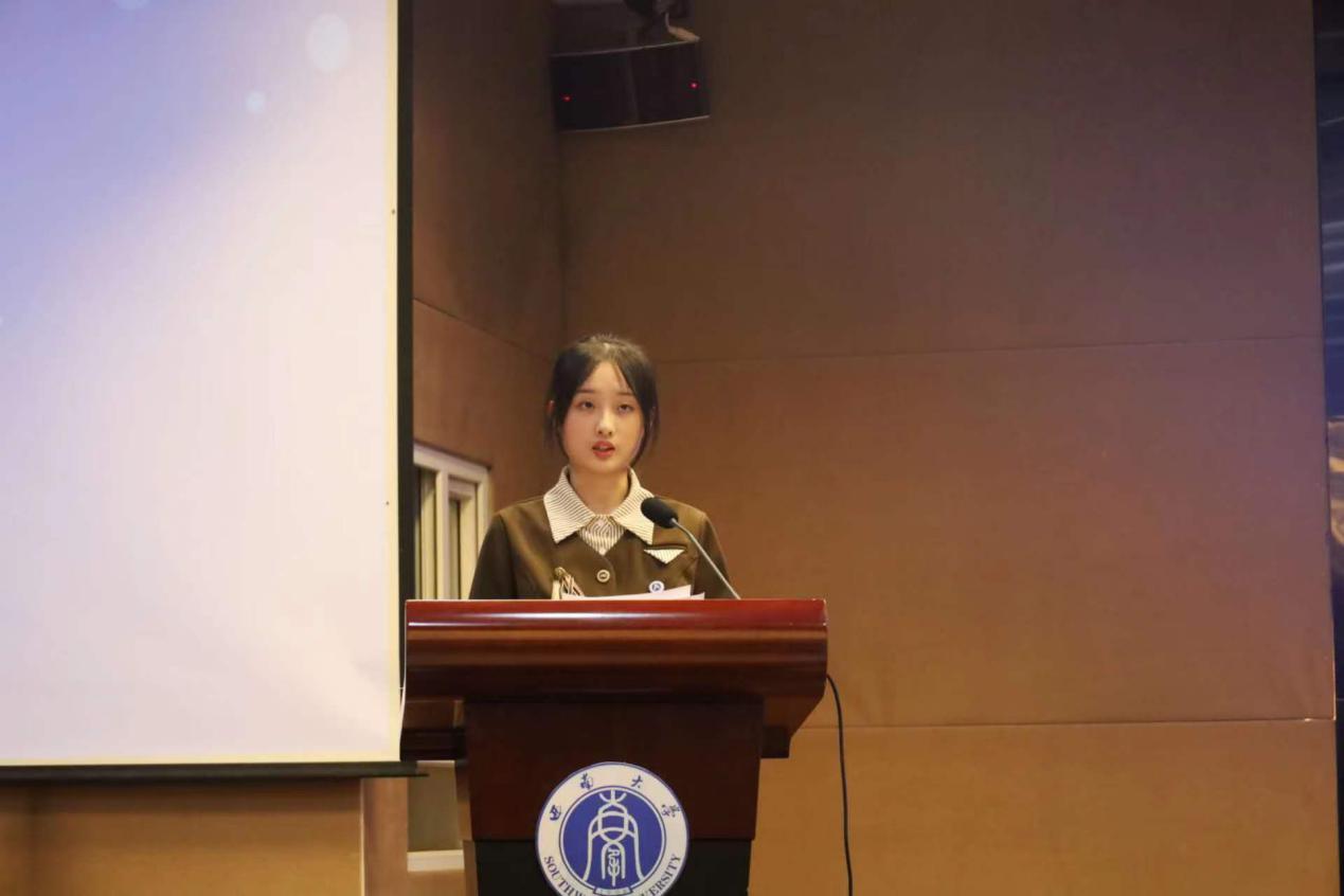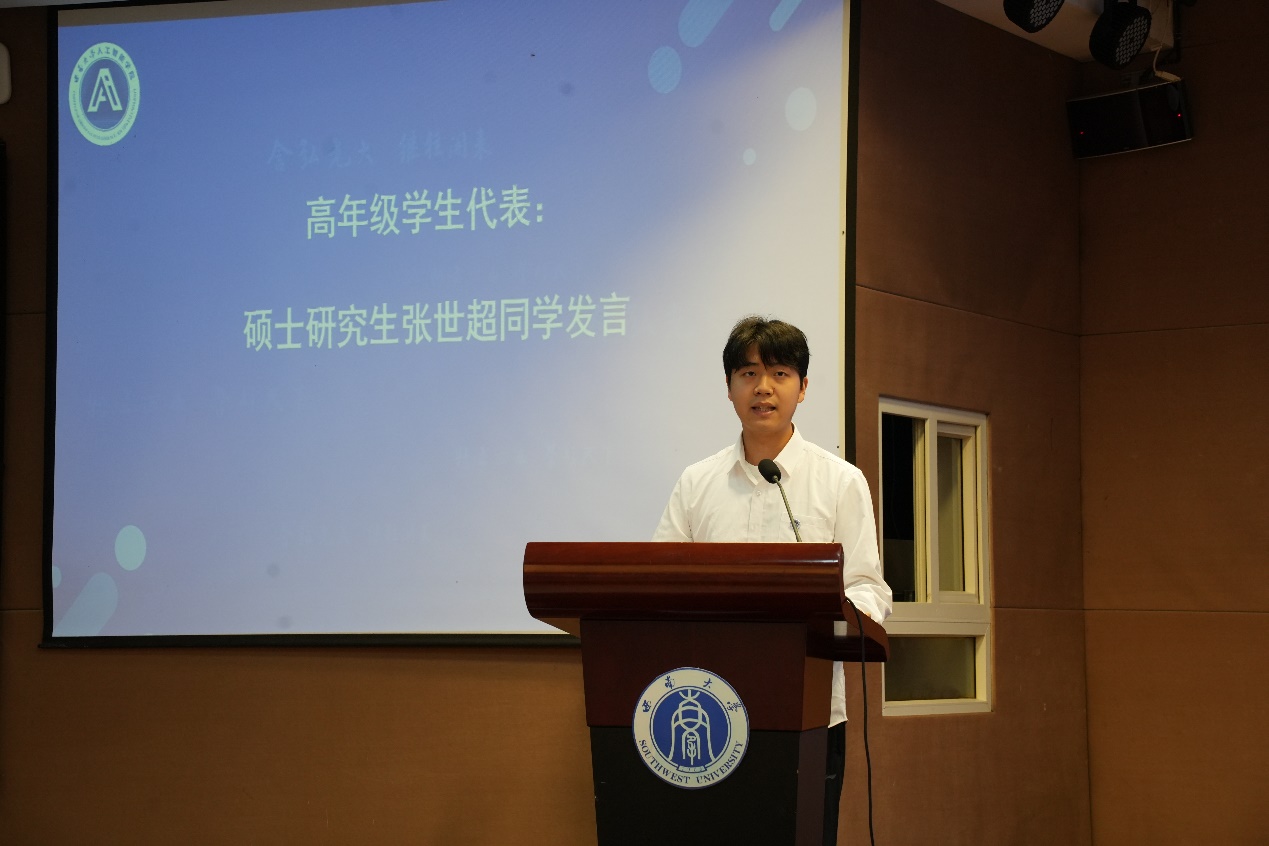 2022级计算机科学与技术专业硕士研究生张世超同学作为高年级员工代表发言,他对在座全体新生表示热烈的欢迎与祝贺,并向新同学们分享了自己学习生活的经验与思考,他指出创新思维,团队合作以及课外生活对于老员工的意义,希望同学们永葆青春活力,学会合作、学会生活,谨记“含弘光大,继往开来”这一校训,不负青春,不负韶华。