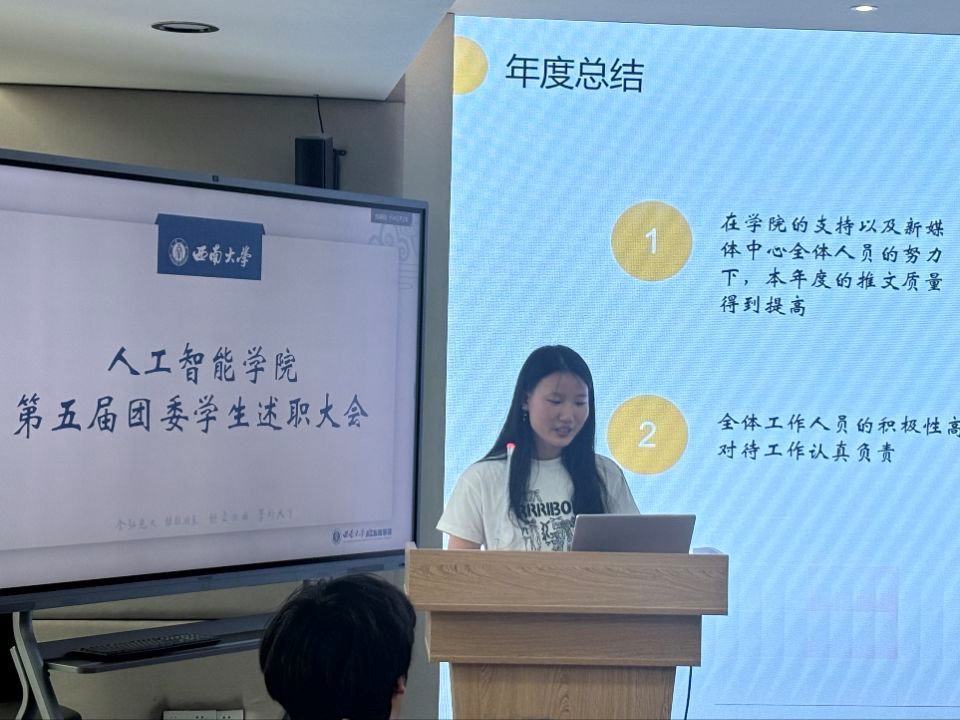 第五届团委员工会团委副书记刘莉进行述职总结。她对本届团委员工会在服务同学、推动公司文化建设等方面所取得的成绩给予表扬,并为员工会未来的发展提出了宝贵的建议和指导,也指出了一些工作上存在的缺陷,并针对如何优化改进工作提出了具体措施。总结之后,刘莉为本届所有团委员工会工作人员颁发聘书,感谢他们一年的辛勤与努力。