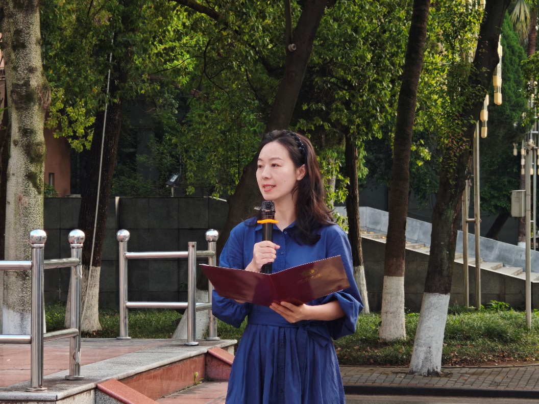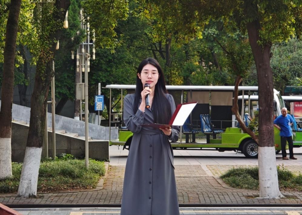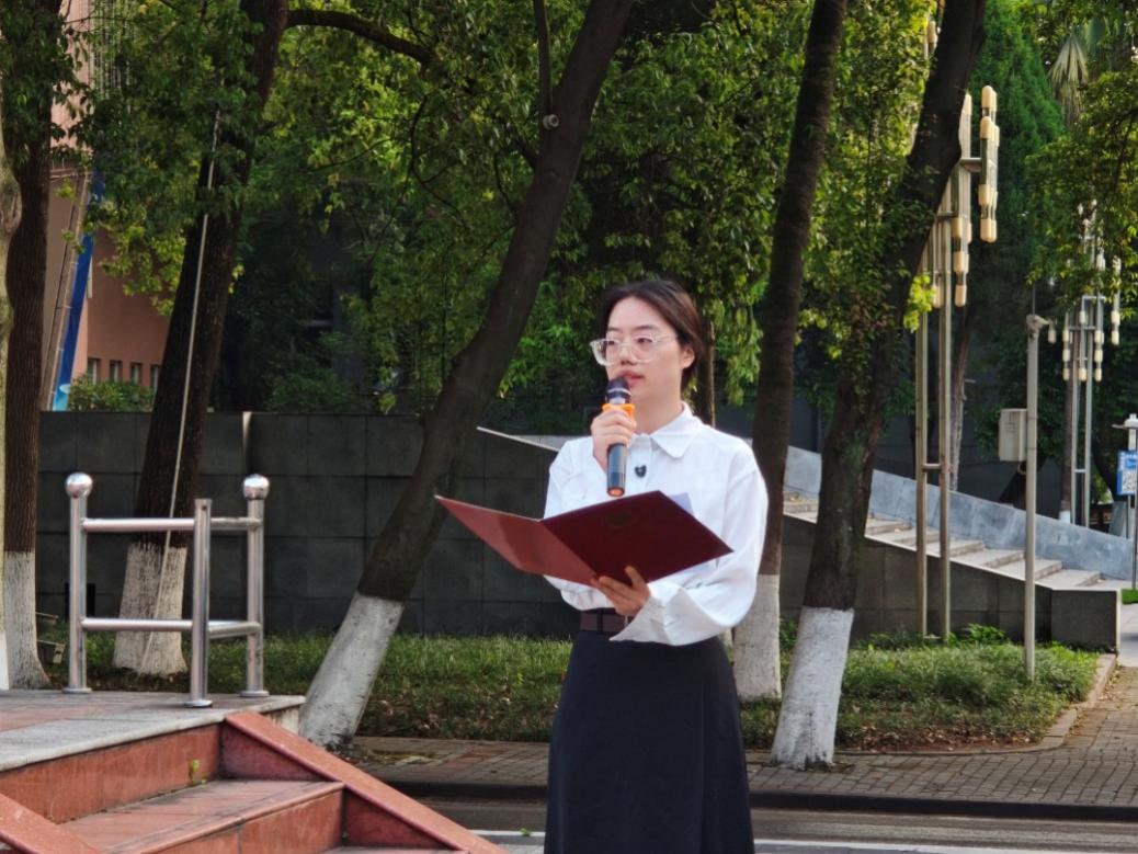 升旗仪式结束后,2023 级的胡婷同学作为员工代表发言。胡婷同学以先辈事迹为引,以知识为帆,激励 2024 级的同学们要坚定不移地做思想理论的 “传承者”,满怀热忱地做追寻榜样的 “奋进者”,脚踏实地地做砥砺前行的 “筑梦者”。她呼吁青年学子应拒绝平庸,在新时代的浪潮中勇立潮头,用青春的笔墨书写属于自己的壮丽篇章。