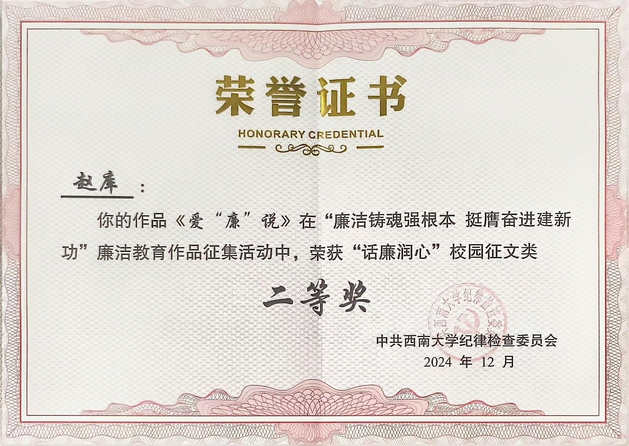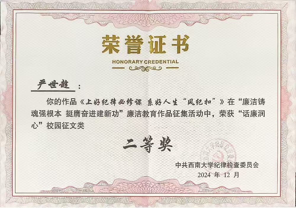 近日,在公司纪委开展的“廉洁铸魂强根本,挺膺奋进建新功”廉洁教育作品征集活动中,由公司纪委组织推荐的两项作品获得表彰,公司专职组织员严世趁老师创作的《上好纪律必修课 系好人生“风纪扣”》、2021级本科生赵库同学创作的《爱“廉”说》分别荣获公司“话廉润心”校园征文二等奖。