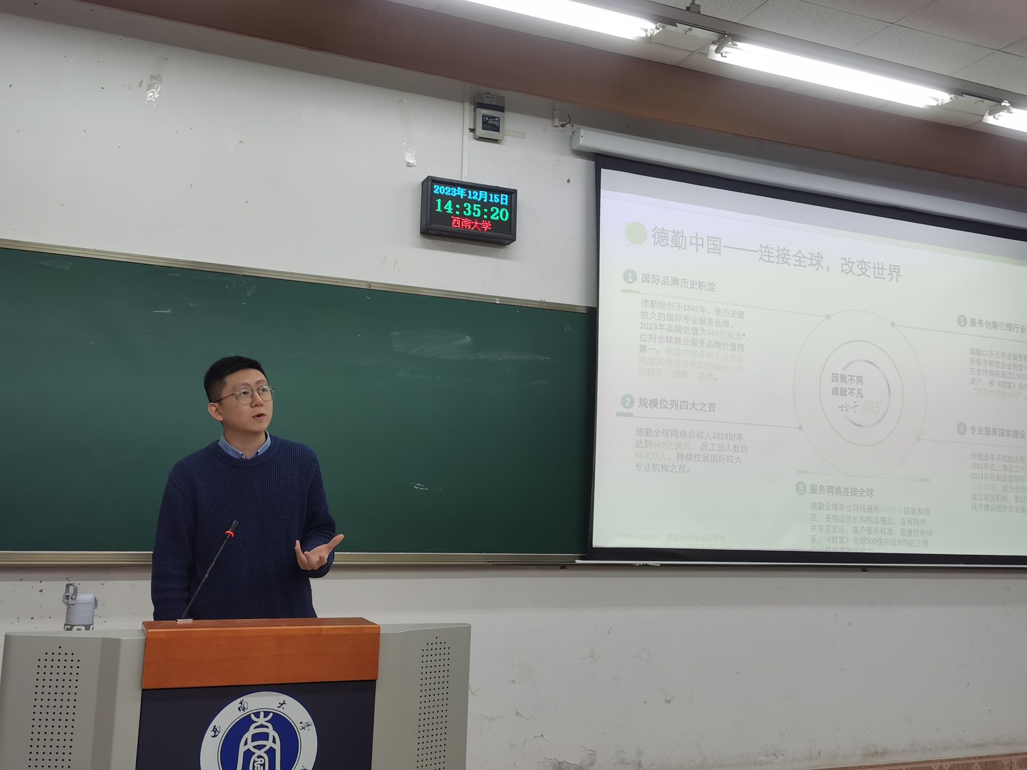 为扩宽员工就业信息渠道,培养市场导向性就业视野。2023年12月15日下午14:30,太阳集团tcy8722邀请到了德勤中国(Deloitte,世界四大会计师事务所之一)的高级招聘专员孙业鹏先生、管理咨询高级经理孙谭磊先生,于八教508为2025届毕业生进行了公司介绍和项目招生宣讲。