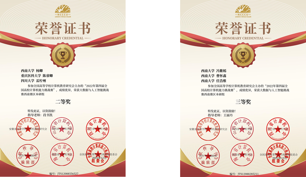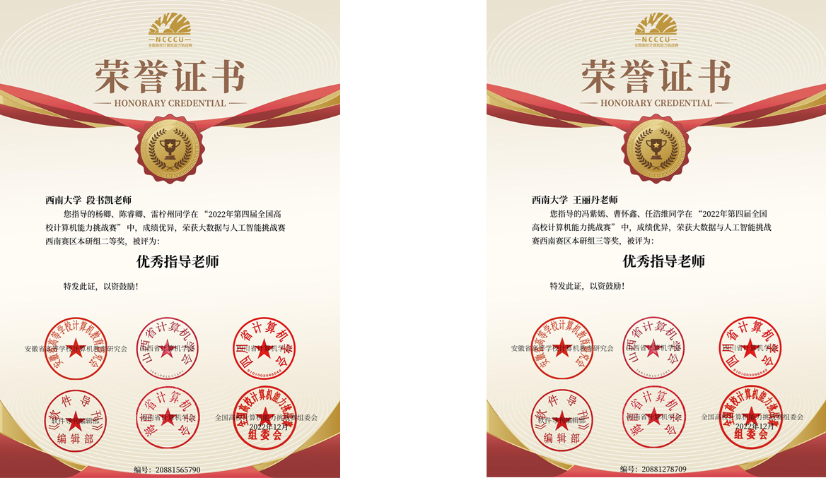 在大数据与人工智能赛项中,经过区域赛和国赛两轮选拔,由段书凯教授指导的杨卿、陈睿卿、雷柠州团队荣获全国三等奖、西南赛区二等奖,由王丽丹教授指导的冯紫嫣、曹怀鑫、任浩维团队荣获西南赛区三等奖,段书凯教授、王丽丹教授分别被评为优秀指导老师。