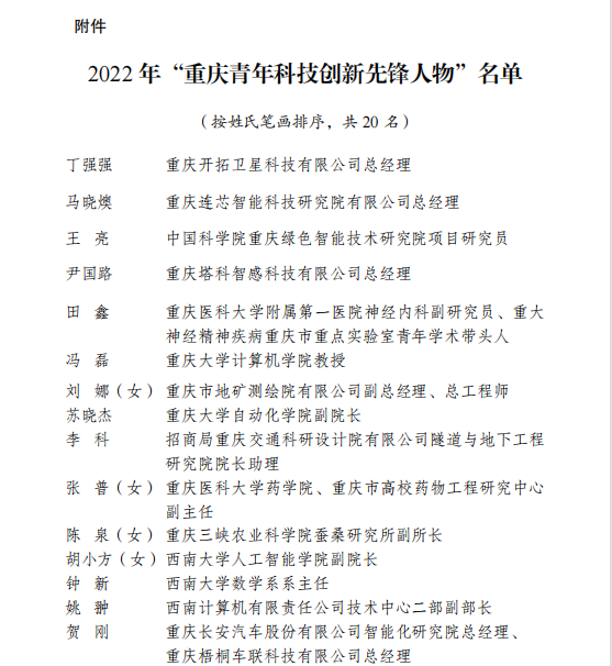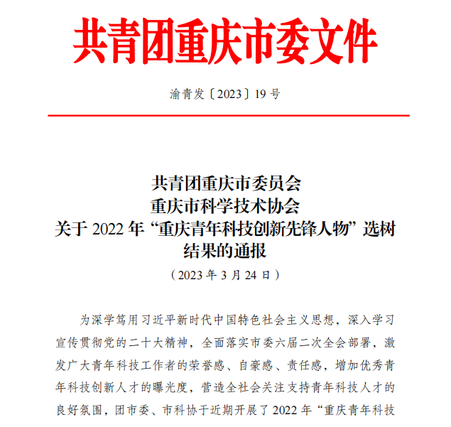 5月30日是第七个全国科技工作者日。当天以“点亮精神火炬”为主题的2023年重庆市“全国科技工作者日”主题活动在重庆科技馆举行。活动现场公布了2023年重庆市“最美科技工作者”10人及提名奖获得者10人、首届“重庆市最美工程师”10人、2022年“重庆青年科技创新先锋人物”20人名单,并进行颁奖。太阳集团tcy8722胡小方教授获评“2022重庆青年科技创新先锋人物”。