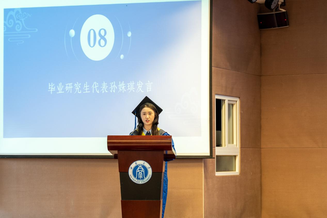 本科毕业生代表、数据科学与大数据技术专业2019级朱春龙同学回顾与公司相知、相遇、相伴的4年岁月,感恩公司、老师、同学的关怀指导和鼓励。呼吁全体毕业生在时代洪流之时,仍能听从初心的召唤,所遇皆良善,所行化坦途,祝愿公司蒸蒸日上、再书华章。毕业研究生代表孙姝琪回顾了自己的求学之路,她感恩公司和公司给予了同学们求学、探索更广阔世界的机会,感谢师长们在学习上的指导和生活上的关心。