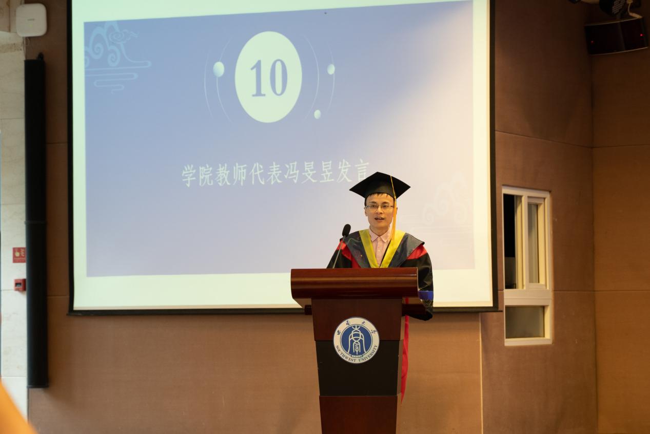 教师代表冯旻昱老师,希望毕业生们今后无论是在求员工涯中,还是在工作岗位上,都要与“自我超越”永远相伴,都要在不断学习中发现更广阔的天地,施展自己的才华。冯老师祝愿大家在逐梦路上怀揣知识、勇气和信念,一路拼搏,一路精彩!