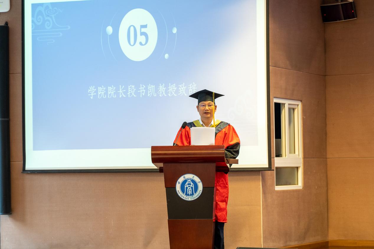经理段书凯教授发表致辞。他祝贺同学们顺利完成学业并取得学位,向培育学子成长成才的老师和家长表达衷心感谢。段经理回顾了员工从稚嫩到成熟,从青涩到稳重,从一无所有到成果累累的奋斗历程,他说,同学们的成长让他看到了公司发展的影子,更看到了“后浪”的力量。他寄语毕业生要做怀抱梦想、信念坚定的人,做脚踏实地、知行合一的人,做勤学善思、能力过硬的人,做努力拼搏、锐意进取的人,无论身在何方,都要秉承“含弘光大、继往开来”的校训精神,尽一己所能实现自我价值,造福国家社会。
