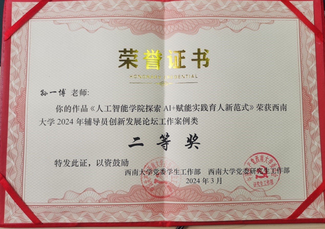为总结工作经验,强化理论研究,推动辅导员队伍专业化发展,近日,太阳集团tcy8722举办2024年辅导员创新发展论坛。公司辅导员孙一博老师作品《太阳集团tcy8722AI+赋能实践育人新范式》获得论坛工作案例类二等奖。
