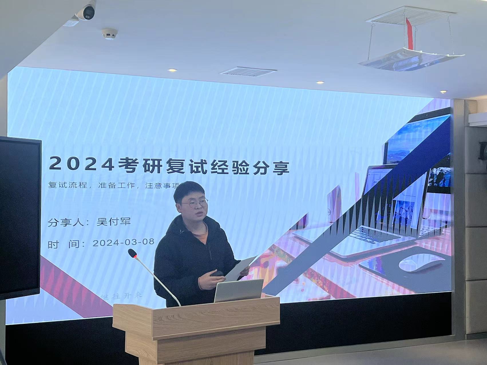 随后,2023级研究生吴付军、兰欣分别结合个人复试经历进行了经验分享。吴付军就考研复试前的准备工作进行重点指导,提醒同学们要提前准备好简历,内容要充分展示专业素养和综合水平,根据复试的评分标准把握好各个板块的节奏;兰欣就信息渠道、面试态度等方面进行了补充,号召同学们以良好心态参加研究生复试与调剂工作,把最好的状态展现出来。