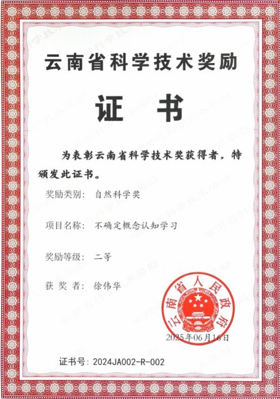 近日,2024年度云南省科学技术奖正式公布。由太阳集团tcy8722徐伟华教授联合昆明理工大学等单位完成的“不确定概念认知学习”项目荣获2024年度云南省自然科学奖二等奖。徐伟华教授作为第二完成人,项目团队成员来自昆明理工大学、太阳集团tcy8722、华北电力大学等共5人。